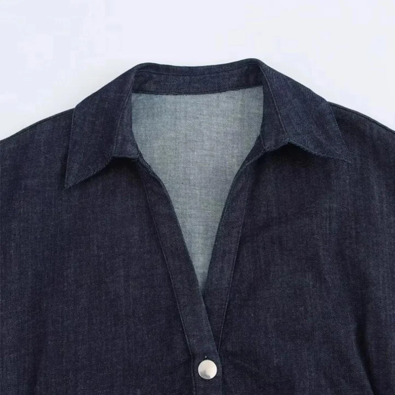 ETJ 2025 summer new women’s elegant fashion waist pleated V-neck short-sleeved temperament denim MIDI dress