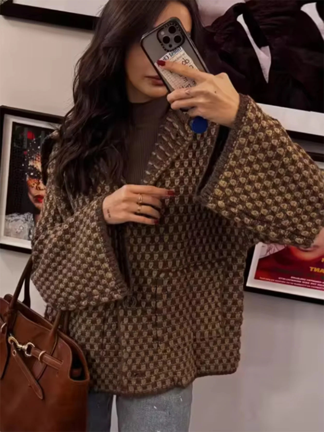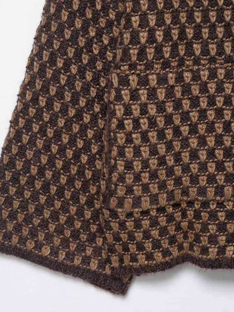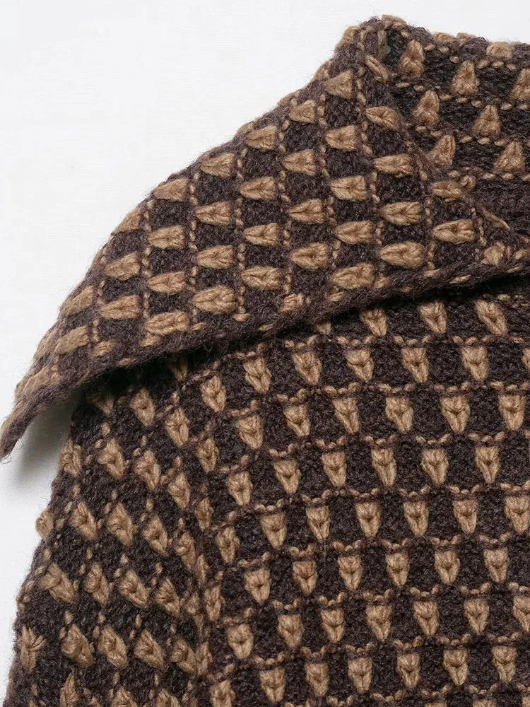 2025 New Women Fashion Plaid Knitted Cardigans Long Sleeve Scarf Collar Sweater Cardigan Autumn Winter New Style Knitwear Coat
